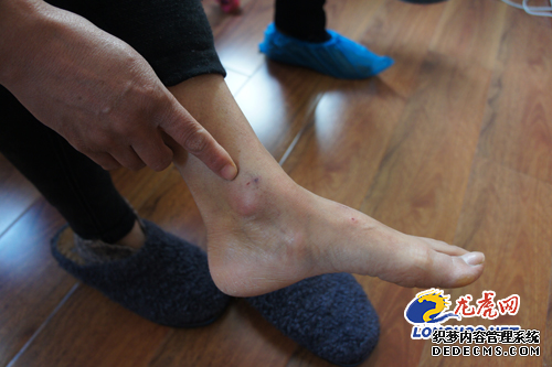下午3点,记者来到位于南湖路28号金虹花园2栋501室的业主陈先生家中,走进厨房看到地面上还有脱落下来瓷砖碎片,其中3块砖脱落,另一块砖已被陈先生取下来,脱落部分的墙壁目前成裸露状态。据受伤的陈先生母亲杨女士介绍,昨天中午12点,她在厨房吃饭,烟道处的瓷砖突然脱落砸下来,杨女士没来及躲闪,有一片瓷砖直接砸到自己的脚上,导致右脚脚踝受伤。记者看到,杨女士的脚踝处确实肿了一块,脚面及脚腕处也有伤痕。“厨房右侧墙面不知道会不会出现脱落,我现在都不敢进去了”杨女士担心称。